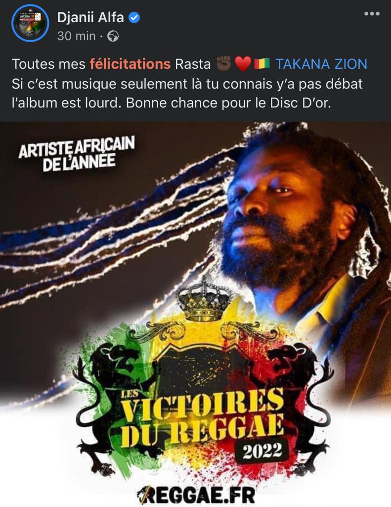 « Toutes mes félicitations Rasta ✊🏿♥️🇬🇳 Takana Zion Si c’est musique seulement là tu connais y’a pas débat l’album est lourd. Bonne chance pour le Disc D’or.»