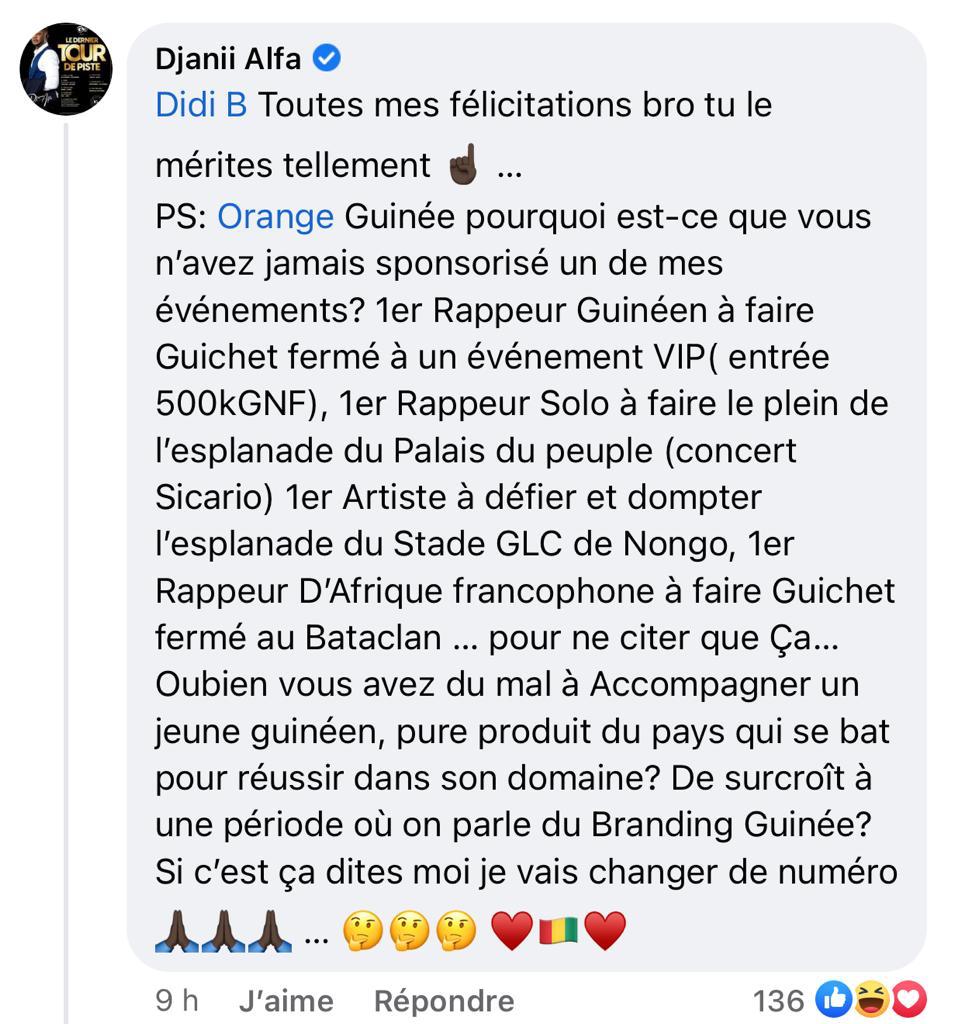 C’est après une publication de l’image de l’artiste Didi B sur la page facebook d'Orange Guinée que Djanii a enfin débarqué en commentaire pour cracher ses mots à cette société qui n’a jamais sponsorisé un de ses événements.
