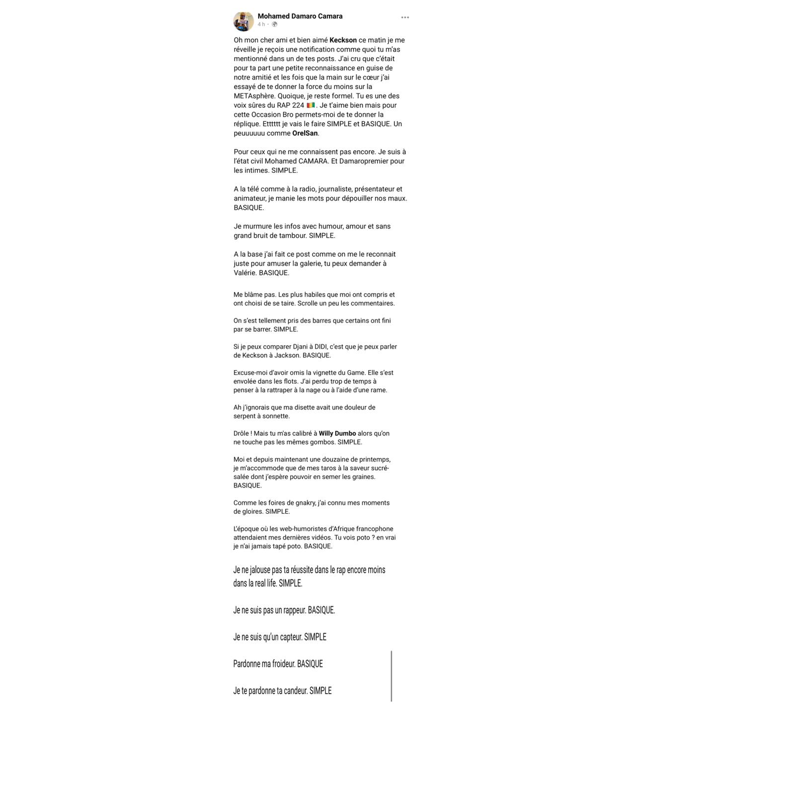 Une publication qui a fait réagir Mohamed Damaro Camara journaliste au groupe HADAFO MÉDIAS. Ce dernier a partagé la publication du rappeur ivoirien en mentionnant Djanii Alfa et Keckson.