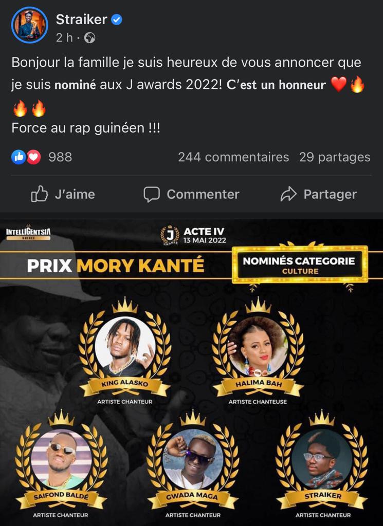 C’est via sa page Facebook qu’il annonce la nouvelle en disant ceci : « Bonjour la famille je suis heureux de vous annoncer que je suis nominé au J-Awards 2022 ! C’est un honneur …… Forcé au rap guinéen !!! »